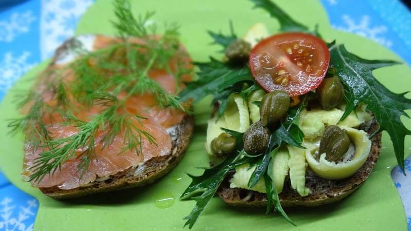 Dziś na szybko zrobiłam dwie kanapki, każda inna, obie bardzo smaczne. Wersję z łososiem i świeżym koperkiem skropionym sokiem z cytryny znałam od dawna, jednak kanapkę z awokado robiłam pierwszy raz. Okazuje się, że główny składnik guacamole, awokado świetnie smakuje także i w wersji kanapkowej. A że ma on dość charakterystyczny smak i sam w sobie jest raczej mdły i średnio smaczny (no dobra, powiedzmy, że jadłam lepsze rzeczy niż samo awokado) dodałam jeszcze 3 listki rukoli, która o dziwo nadal świetnie rośnie mi na balkonie, a także kilka kaparów i plasterek pomidora. Całość, podobnie jak w przypadku kanapki z łososiem, skropiłam cytryną.